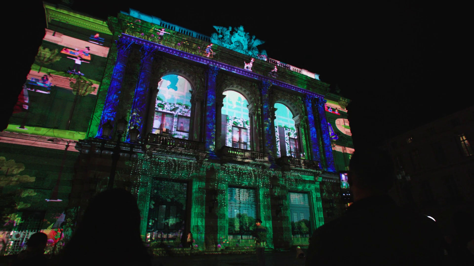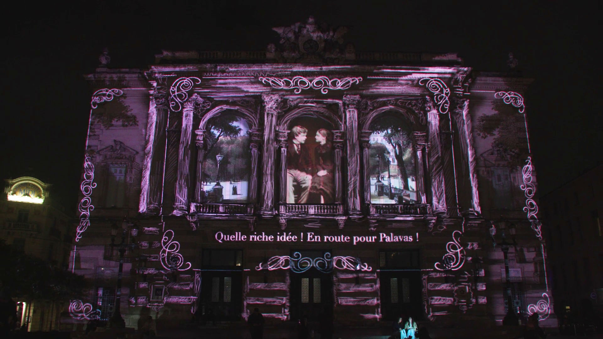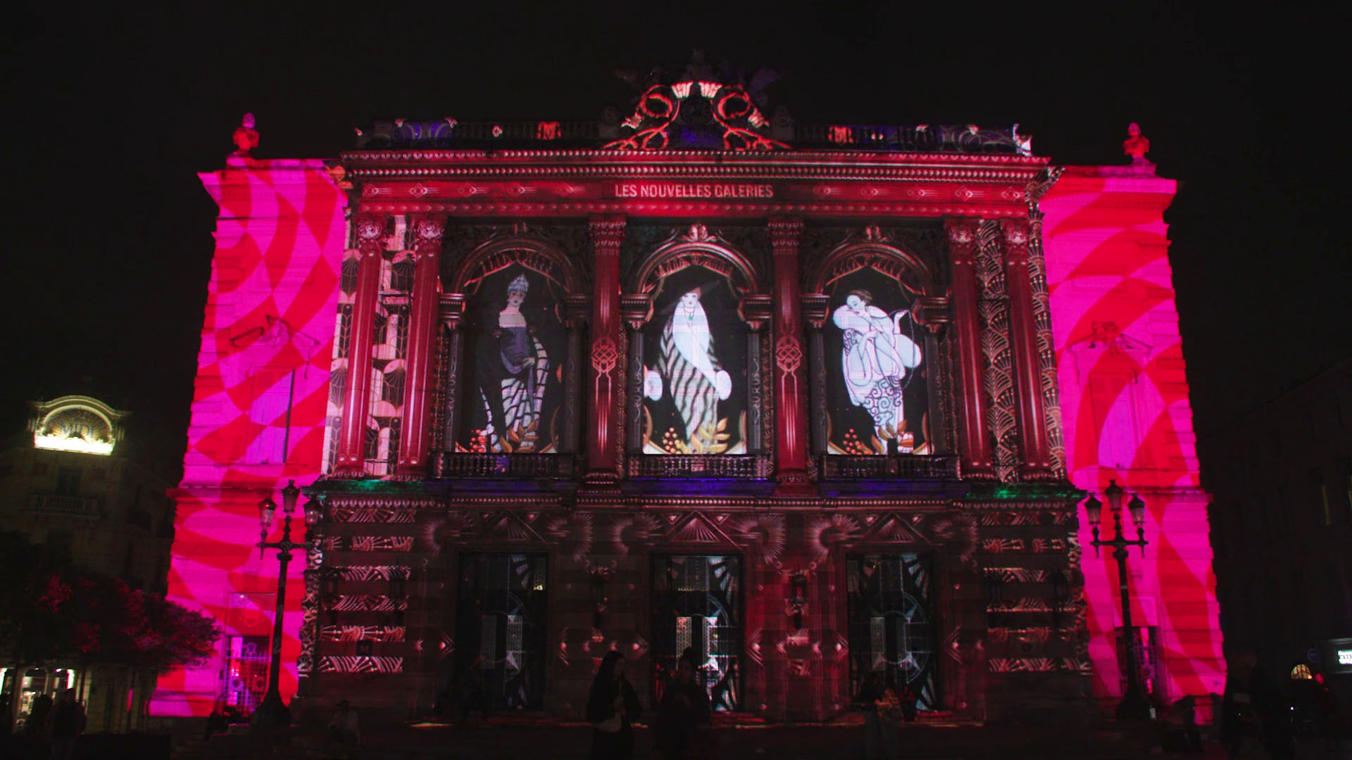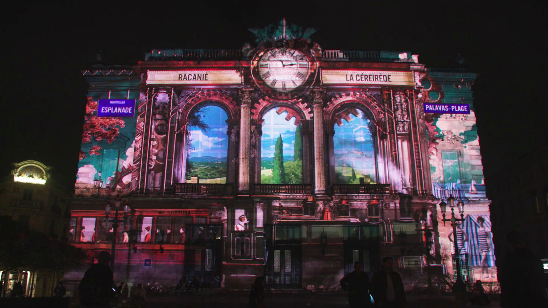 À travers un vidéo mapping dynamique et haut en couleurs, l’Opéra Comédie a été revisité par l’artiste Leslie Epsztein, au fil des époques et des diverses influences culturelles.